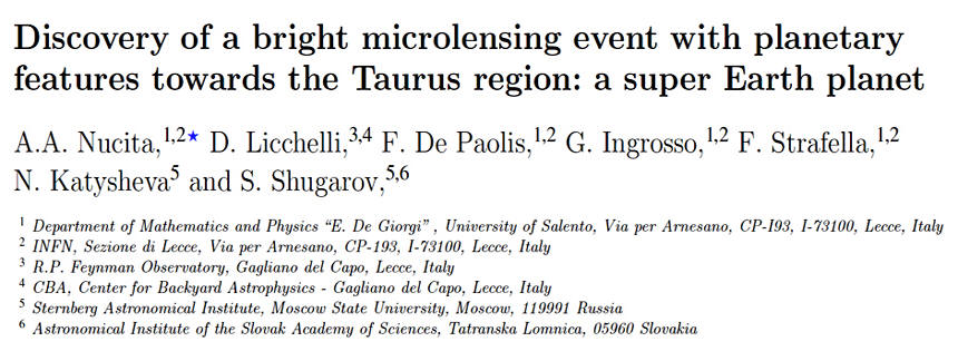 Discovery of a bright microlensing event with planetary features towards the Taurus region: a super Earth planet - A.A. Nucita, Licchelli, D. , F. De Paolis, G. Ingrosso, F. Strafella, 104° Congresso Nazionale della Società Italiana di Fisica, Cosenza, 20 Settembre 2018